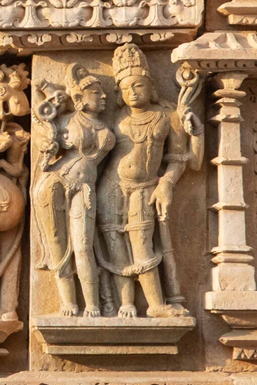 Altre forme scolpite appaiono nelle vicinanze in posture vivaci e attive: fianchi ondeggianti, braccia piegate e teste inclinate, tutte scolpite in rilievo profondo sottolineando la loro tridimensionalità. È qui, in particolare che i devoti incontrano immagini erotiche di coppie abbracciate in unione sessuale. Bisogna sottolineare che le sculture più erotiche ornavano solo le mura esterne, lontano dalle divinità.