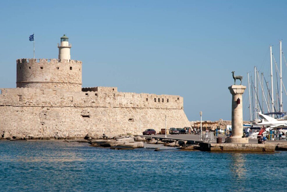 Qui all’ imboccatura del porto si trovano due colonne sormontate da due statue di daini: un maschio dalle corna ramificate e una femmina. Secondo la tradizione le colonne poggiano nello stesso punto in cui poggiavano i piedi del colosso di Rodi: un’enorme statua di Elios, il dio del Sole, posta a guardia del porto.