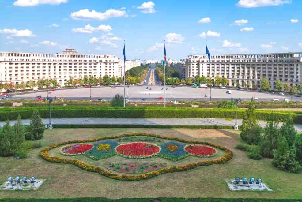 Il bel viale che si propaga davanti alla facciata del Parlamento di Bucarest